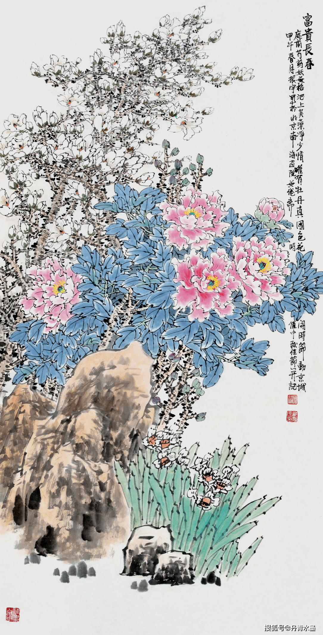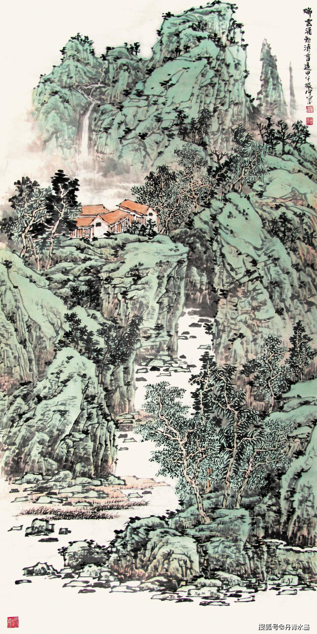 先生由工笔花鸟转笔于山水创作,用超能的水墨功夫和青绿浅绛的渲染水准,把山水画兼工带写到云来山更妙,云去山如画的苍润境界,色不碍墨,墨不厚色,相得益彰,流丽雅致。空间布置得相当和谐,上突有危峰,下览有深谷,东崖复沓蔽轻雾,西峰峥嵘喷流泉,可游可居,应物象形,随类赋彩,可达气韵生动